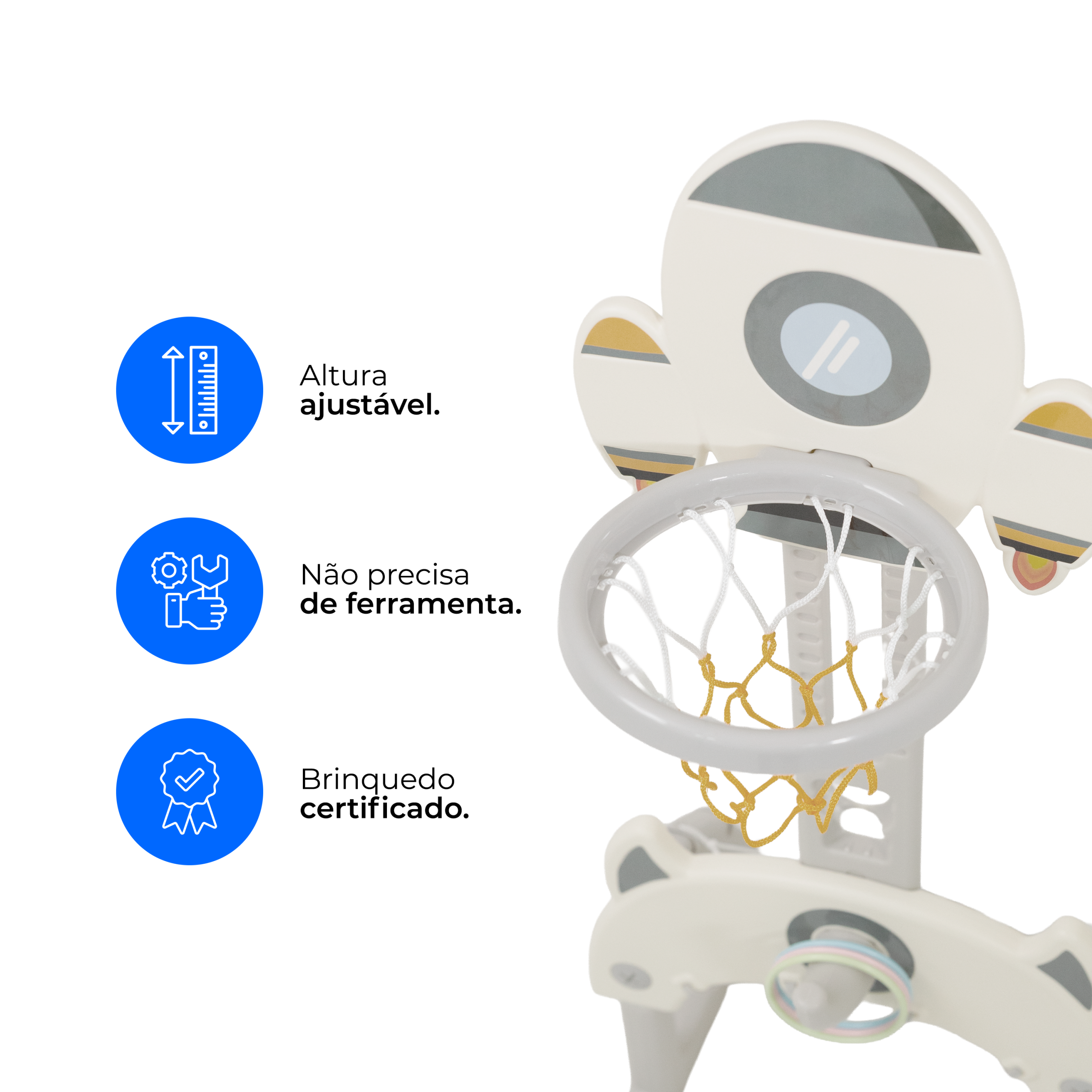 Produzido em plástico resistente e livre de BPA, oferece diversão e aprendizado com total segurança dentro de casa.